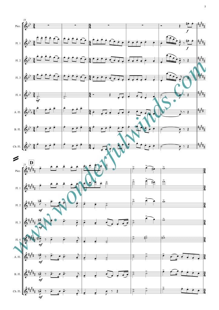 Instrumentation: Flute Choir: Piccolo, 4 C Flutes, Alto Flute, Bass Flute, Contrabass Flute (optional)